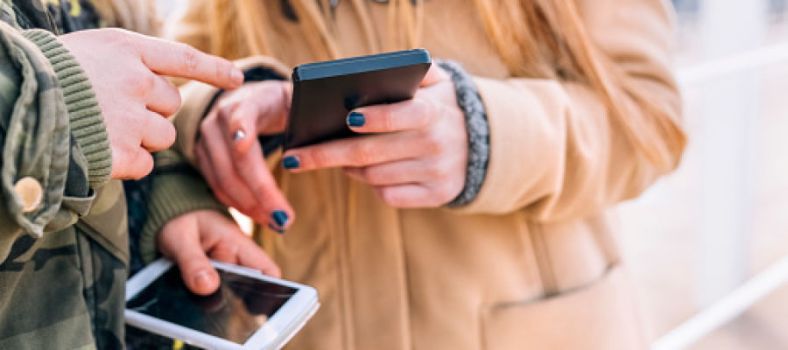 Two friends with their smartphones, partial view
