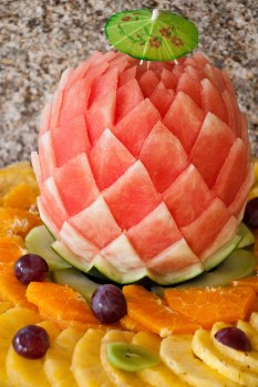Imagen anterior Imagen siguiente Decorated fruit table decorated fruit table setting with watermelon, grapes, orange and pineapple slices