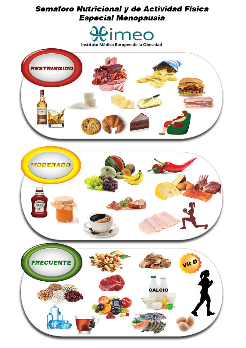 A partir de los 45 años la mujer empieza a perder fibra y tono muscular, que es una beta de oro imprescindible para mantenerla o mejorarla en cualquier edad; es la responsable del 70% de nuestro gasto calórico diario. Con la llegada de la menopausia, el cuerpo femenino entra en cierto declive y produce menos cantidad de estrógeno y progesterona. El déficit de estas hormonas incide de forma directa en la tendencia a perder masa muscular y acumular grasa alrededor de la cintura. La grasa visceral acumulada en esta zona está relacionada directamente con el incremento del riesgo cardiovascular o algunos tipos de cáncer, como el de mama y útero, al igual que la incidencia de diabetes tipo II, hígado graso, colesterol alto o hipertensión. Es por ello tan importante adaptar nuestra alimentación a la necesidad de mantener esta masa muscular, dando prioridad a las proteínas y grasas saludables y a los hidratos de carbono en sus versiones integrales, desechando los alimentos perjudiciales para la salud, recalca Rubén Bravo, portavoz del IMEO y apunta que el 38% de las mujeres que acuden al centro en busca de ayuda profesional apuntan a un perfil condicionado por la transición menopáusica. La dificultad de lidiar con una desventaja añadida a la hora de perder peso ha impulsado al departamento de Nutrición del Instituto a plantearse la necesidad de elaborar una guía visual para que sirva de apoyo a la mujer en esta compleja etapa y que recoja las recomendaciones generales a modo de semáforo nutricional y de actividad física.
