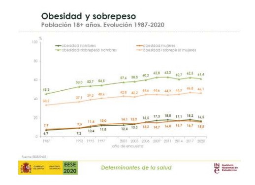 Desde 1987, la obesidad en mujeres ha pasado de un 7,90% a un 15,54% en 2020. En hombres el ascenso ha sido mayor, pasando de un 6,90% en 1987 a un 16,50% en 2020. Respecto a 2017, se ha producido un descenso de 1pp en mujeres y 2pp en hombres.