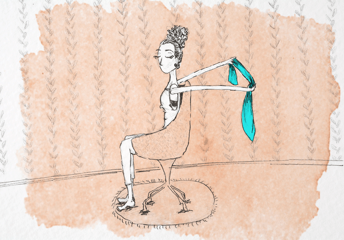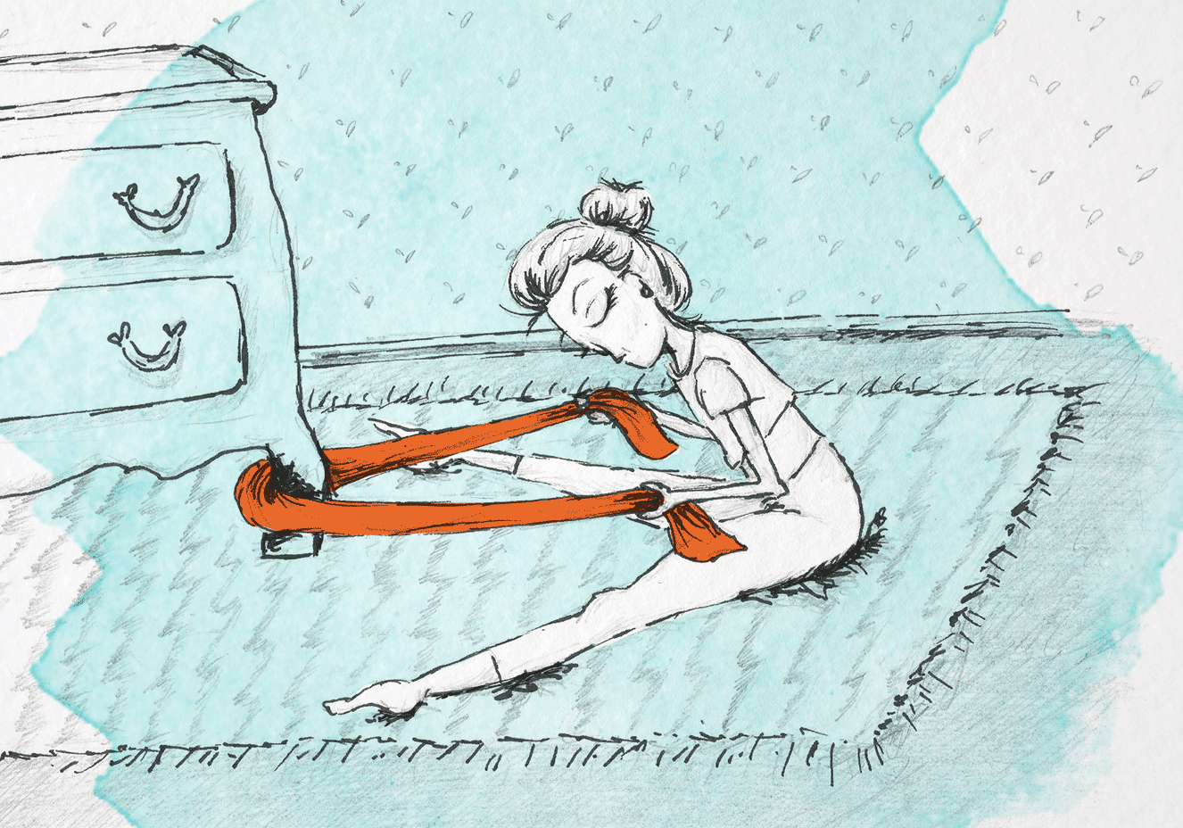 2. Otra vez más hay que fijar la cinta, enrollarla en los brazos para dar apoyo y después cruzar una de las piernas sobre la otra, quedando sobre un solo pie (a la pata coja). A continuación haz el gesto de sentarte, como si lo fueses a hacerlo en una silla con las piernas cruzadas. Repite el movimiento de subir y bajar la cadera, la parte del cuerpo que se trabaja en este ejercicio. También es buena para la musculatura posterior de los brazos.