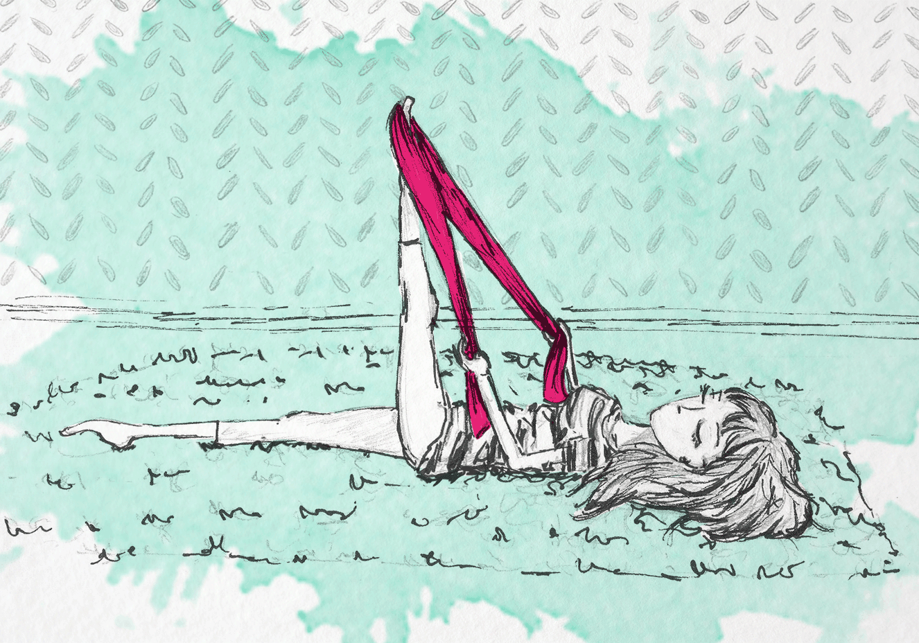 4. Tumbado en el suelo, estira la pierna izquierda, coloca la cinta detrás del pie izquierdo y sujeta cada extremo con las manos. Sube la pierna lo más alto que puedas, sin doblar las rodillas. Mantén la posición durante 20 segundos y a continuación cambia de pierna y repite la operación. Con este ejercicio notarás cómo se estira la parte de atrás de los muslos.