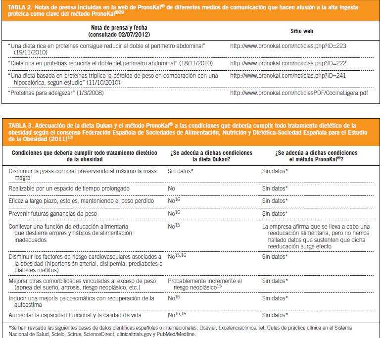 Las solemnes afirmaciones de rigor y ciencia (método PronoKal®) o de eficacia garantizada en el control de peso corporal (dieta Dukan) deben ser contrastadas con las nueve condiciones que debe cumplir, según el más reciente consenso FESNAD-Sociedad Española para el Estudio de la Obesidad, todo tratamiento dietético destinado a tratar la obe-sidad. Al hacerlo (tabla 3)13, apreciamos la ausencia de datos que permitan concluir que la dieta Dukan o el método PronoKal® se acomoden a dichas condiciones.
